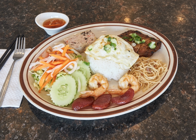It’s a mound of rice served with a grilled pork chop, fried egg, shrimp paste, deep- fried bean curd and fish sauce.